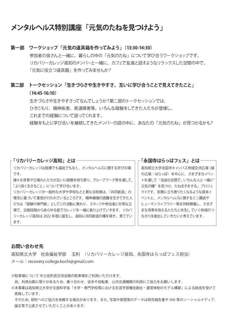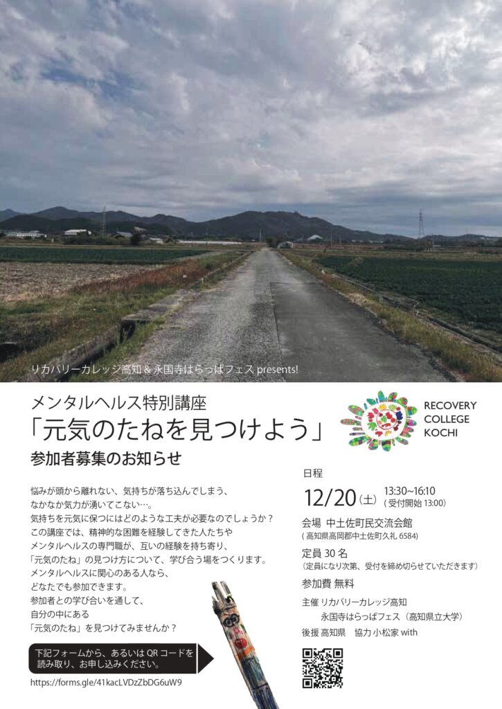 この度、リカバリーカレッジ高知と永国寺はらっぱフェスの共同企画として、**メンタルヘルス特別講座「元気のたねを見つけよう」**を開催します! (広報が遅れてしまい申し訳ございません)